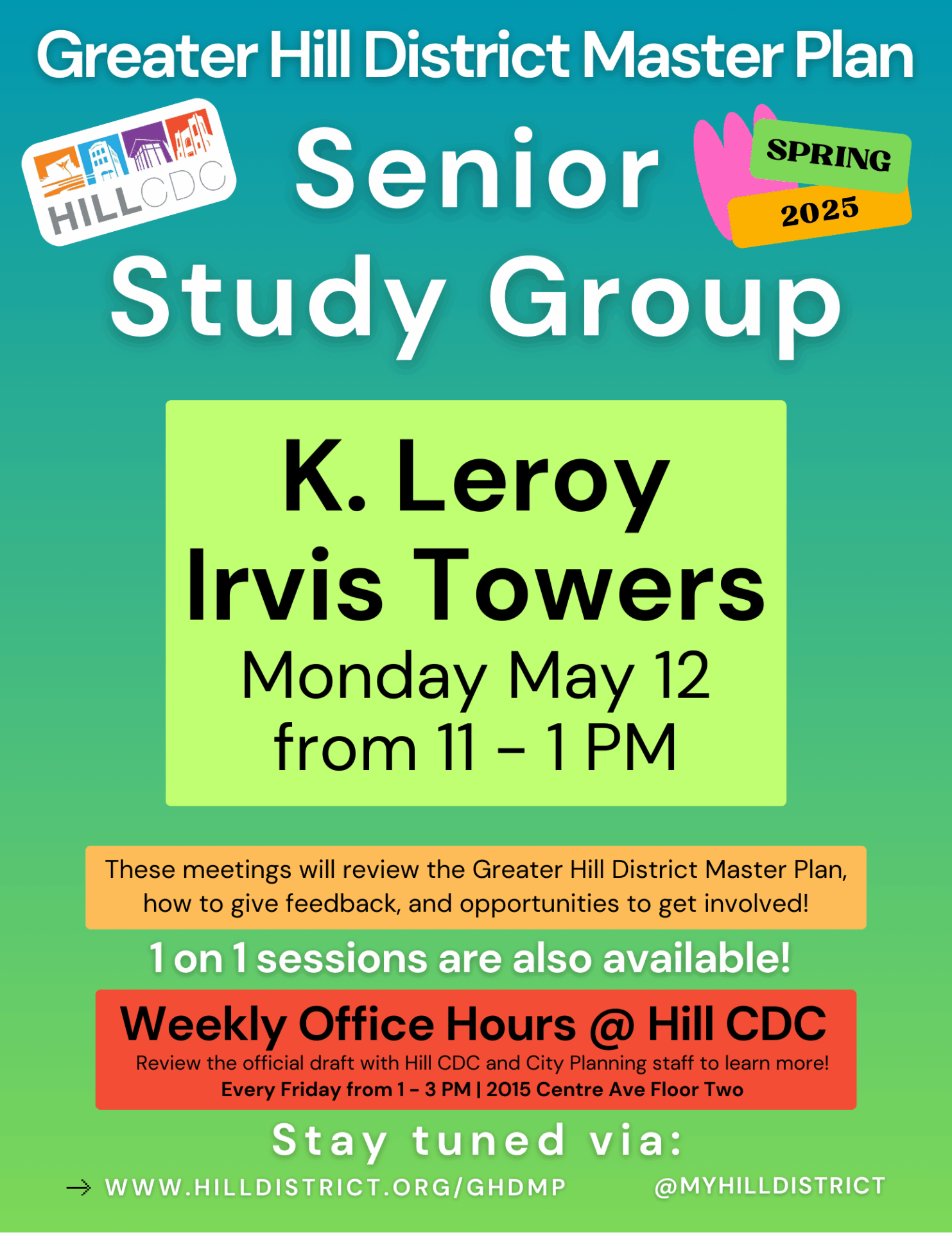 The meeting will be held for seniors on Monday, May 12that K. Leroy Irvis Towers from 11:00 AM to 1:00 PM. Come by, ask questions, and share your thoughts. Your feedback is appreciated and will be forwarded to the City!
