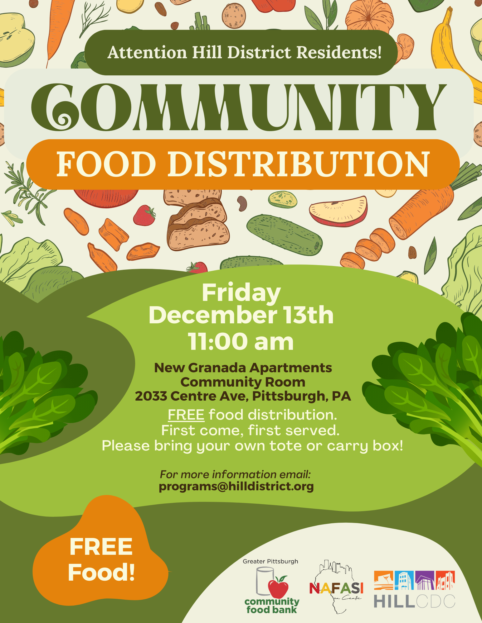 New Granada Apartments Community Room 2033 Centre Avenue, Pittsburgh, United StatesMark your calendars! Don't miss our next FREE food distribution on Friday, December 13th at 11:00 AM! The distribution will occur in the New Granada Apartments Community Room, located at 2033 Centre Avenue.un Bring your own tote or carry box to transport your items. No registration required. See you there!